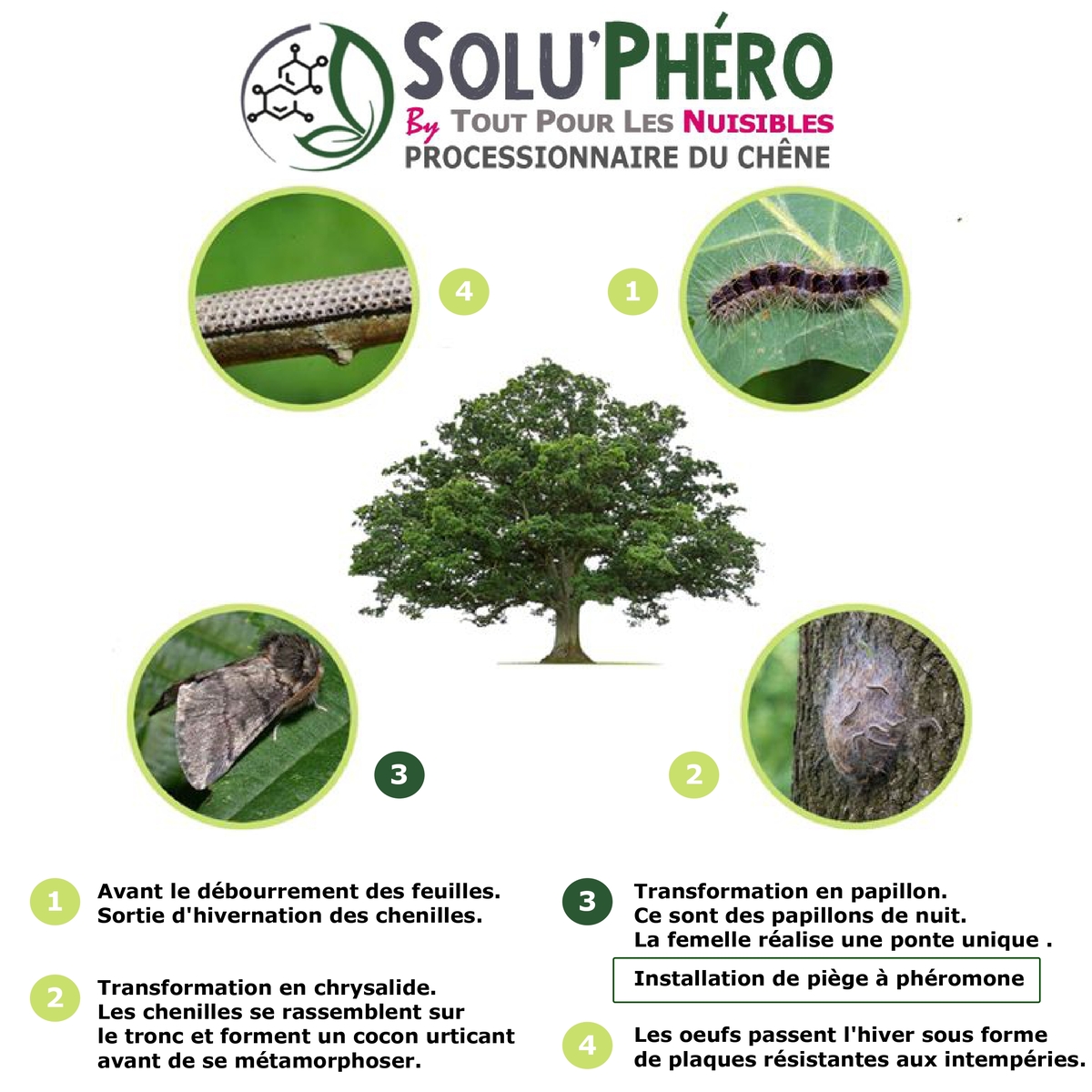 ·Placer le piège dans la canopée de l'arbreà partir de 3 m ou plus, mais toujours en zone ensoleillée et dégagée. ·Prévoir 1 piège tous les 20 arbres ou un piège tous les 100 mètres. ·Remplir le bocal du piège de 0.5 l d’eau et deux gouttes d’huile, de liquide vaisselle non-odorant ou du savon noir non odorant pour empêcher l'eau de s'évaporer et de facilité la noyade des papillons. ·Placer le panier à phéromone sur le couvercle vert et mettre la phéromone dans le fond du panier à phéromone vert (SANS TOUCHER LA PHEROMONE) puis refermer le panier à phéromone avec son opercule de fermeture. ·Disposez le piège dans le chêne. ·Les papillons mâles attirés par la phéromone pénètrent dans le piège et tombent dans l’eau savonneuse. ·Vérifiez visuellement s’il reste de l'eau dans le seau sinon en remettre sans toucher à la phéromone. ·Fin Août, enlever le piège, le nettoyer à l'eau et le conserver pour la saison prochaine où vous devriez mettre une nouvelle dose de phéromone. ·Jeter la phéromone aux ordures ménagères.